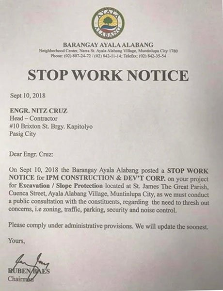 The stop work notice issued by Mr. Ruben Baes, Chairman of Barangay Ayala Alabang. Photo courtesy of Mr. Paul Patrick M. Carague