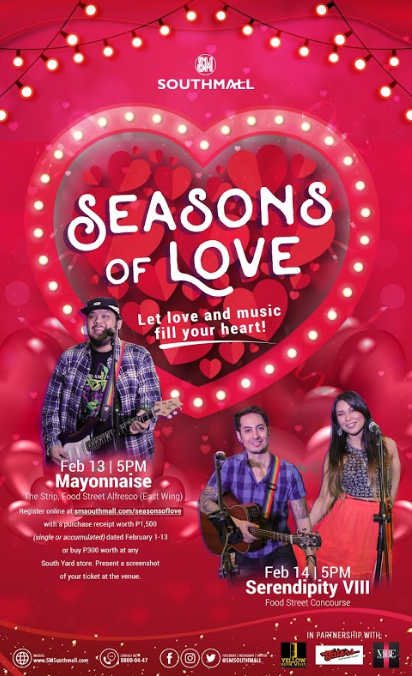 Let love and music fill your heart as Mayonnaise headlines the Seasons of Love Mini Concert at The Strip, Food Street Concourse (East Wing) on February 13, 5PM. To join, just present a single or accumulated receipt of P1,500 from ANY SM Southmall Store from February 1-13 or buy P300 worth of goodies at South Yard. Register online at smsouthmall.com/seasonsoflove. Southies will also be serenaded on February 14, 5PM by musical duo Serendipity VIII at the Food Street Concourse. For further inquiries/updates, follow @SMSouthmall on Facebook and Instagram.
