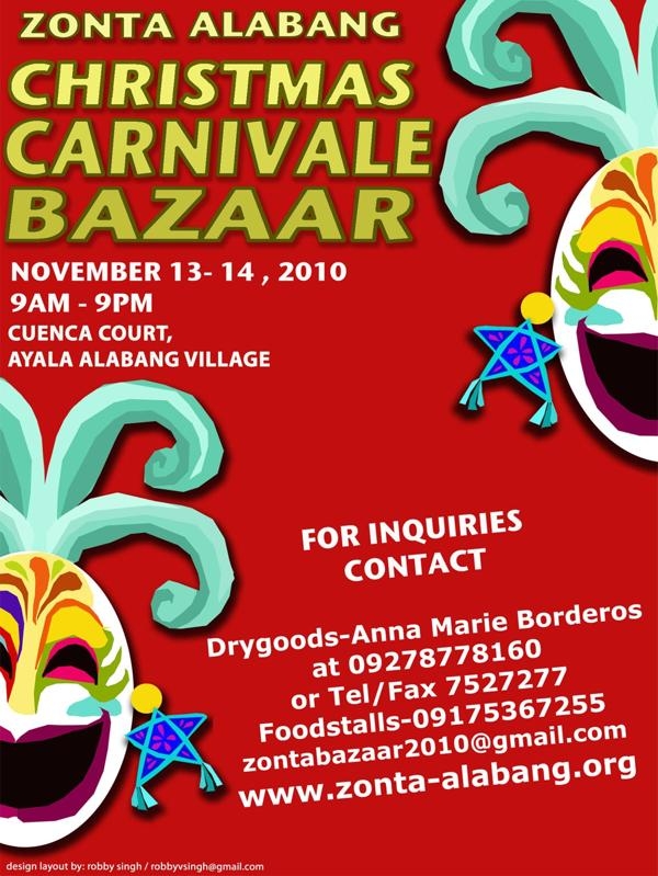 Mark the date! The Zonta Club of Alabang is once again mounting the celebrated Christmas Carnivale Bazaar for the third straight year. It will be held at the Cuenca Gym, Ayala Alabang Village, Muntinlupa City on November 13 and 14, 2010.