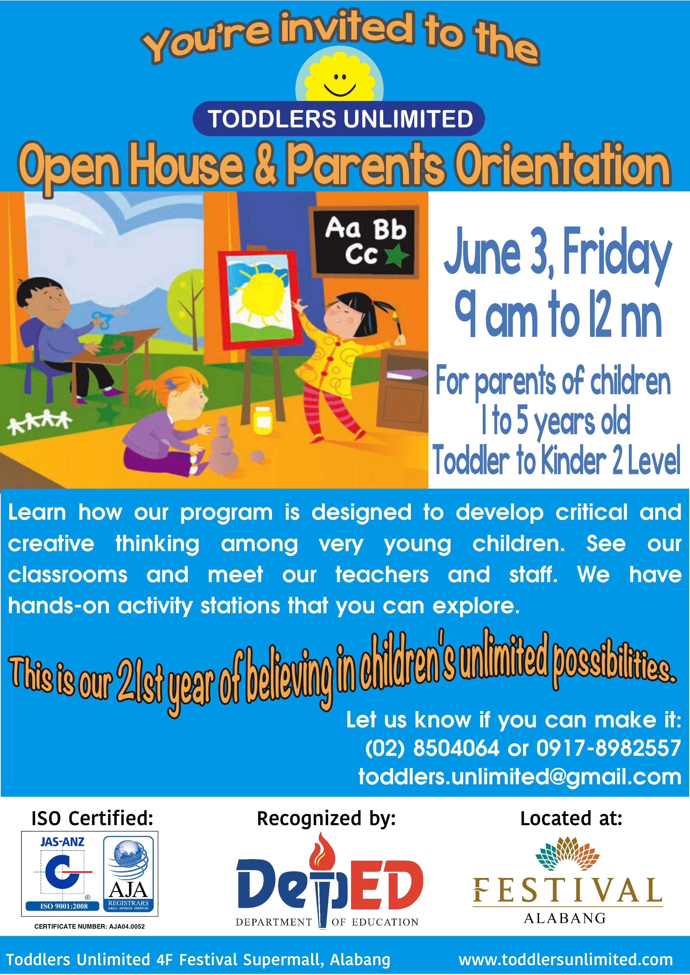 Toddler’s Unlimited FREE Parents Orientation and Open House this Friday! Everyone is invited! by AlabangBulletin · June 1, 2016