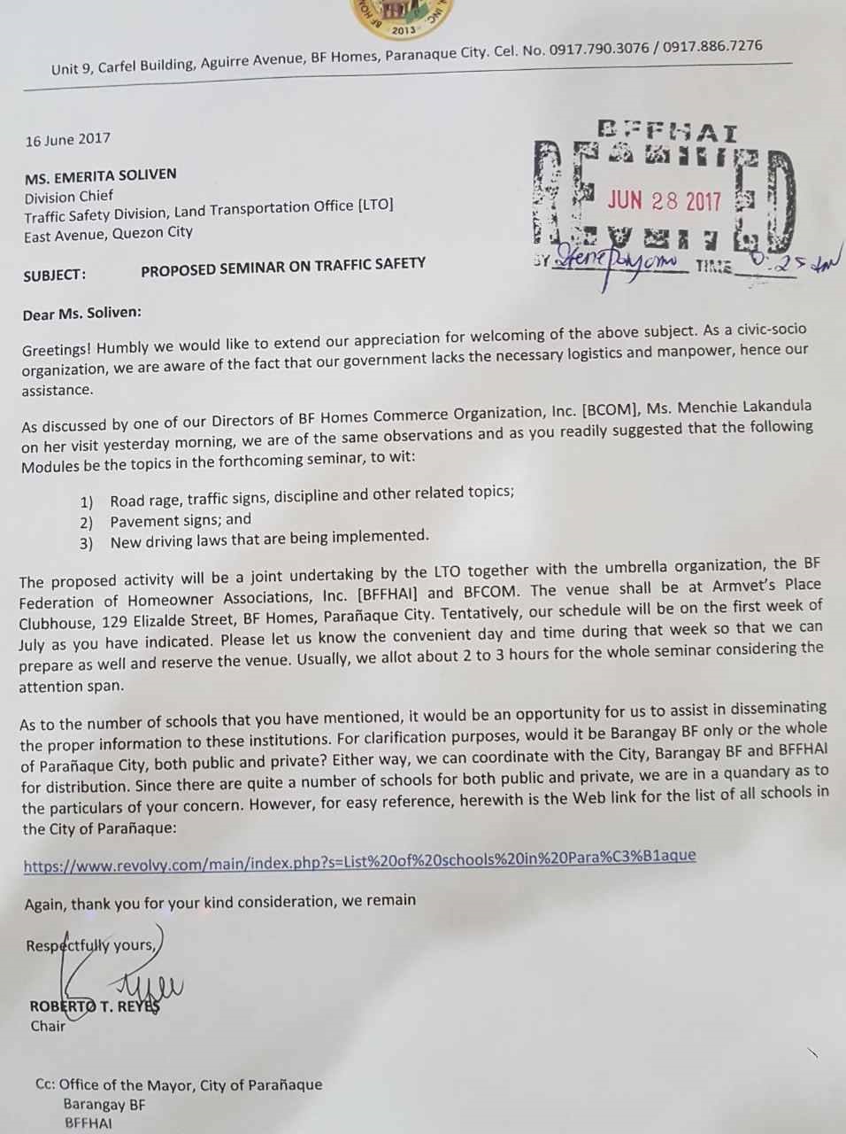 Co-organized by the Land Transportation Office, the BF Federation of Homeowner Associations, Inc. and the BF Homes Commerce Organization, the traffic seminar will be held at the Amvet Place Clubhouse located at 129 Elizalde St., BF Homes in Paranaque City.