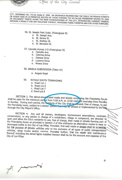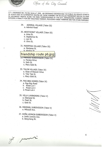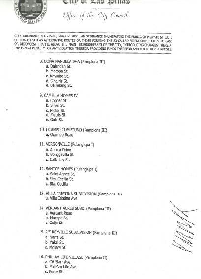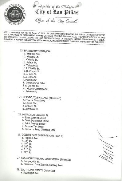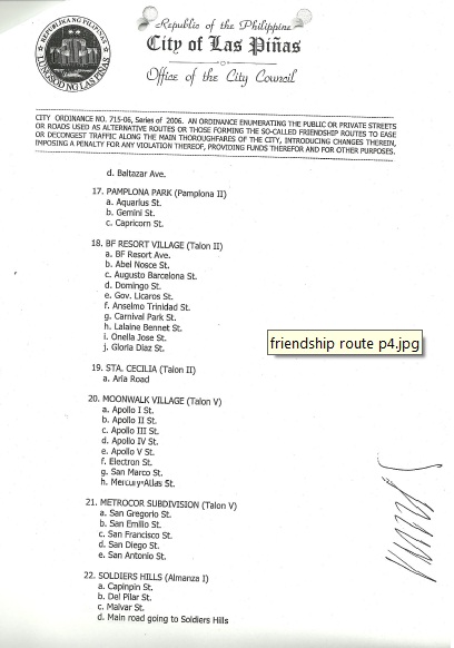 Anyway, for whatever purpose they have, here is the complete ordinance on the participating streets comprising of the Friendship Route in Las Pinas.